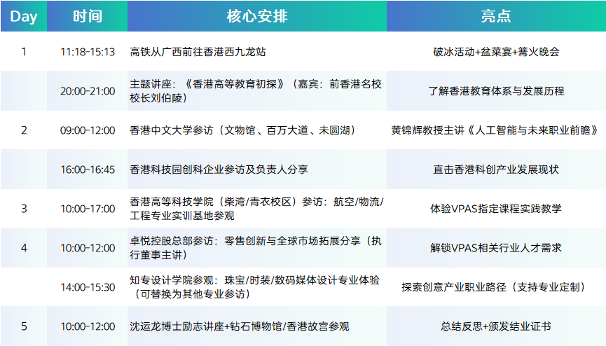 研学活动将助力学员直观了解VPAS:定制行程融合“顶尖教育、名企探索与文化沉浸”,重点解读香港VPAS留港计划,助力留港就业。