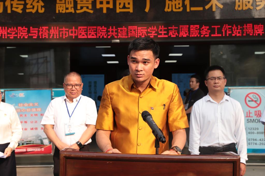 揭牌仪式上,梧州市卫生健康委员会党组成员、副主任陈裕佳说梧州学院和梧州市中医医院国际学生志愿服务工作站的成立,是梧州市贯彻落实党的二十大关于“促进中医药传承创新发展”决策部署的生动实践,是梧州市推进中医药高质量融入共建“一带一路”发展取得的又一可喜进展,为促进中医药对外交流开放合作提供了一个有力平台。